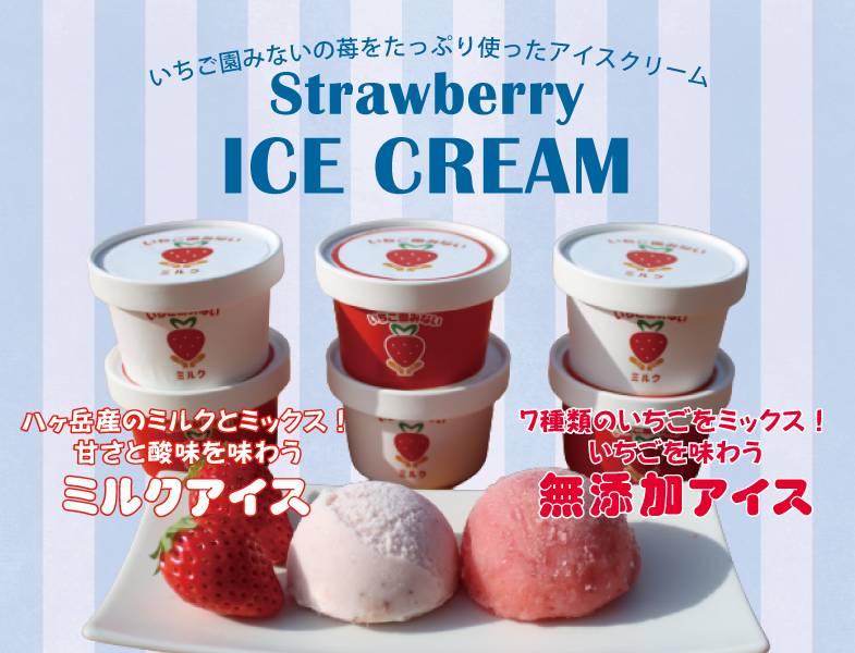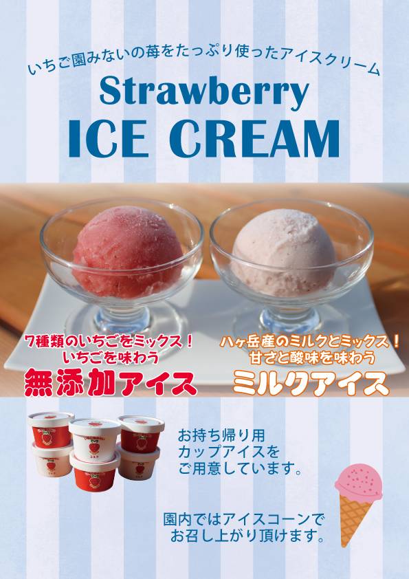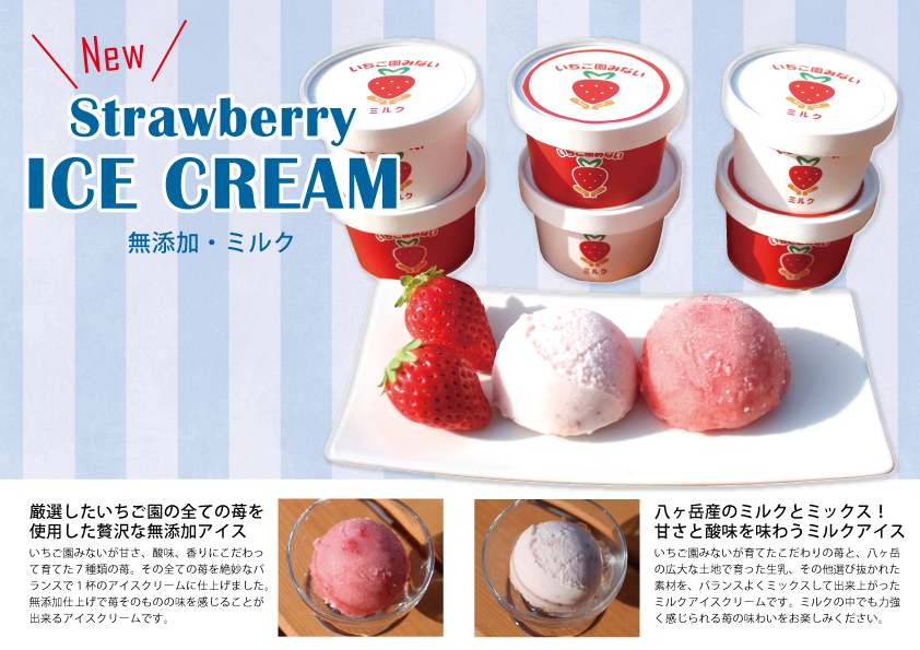 贅沢な「オリジナル無添加アイス」と、八ヶ岳産のミルクを使用した甘みと酸味のバランスが良い「イチゴミルクアイス」の2種類がございます。